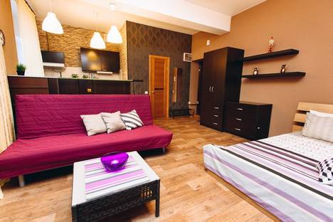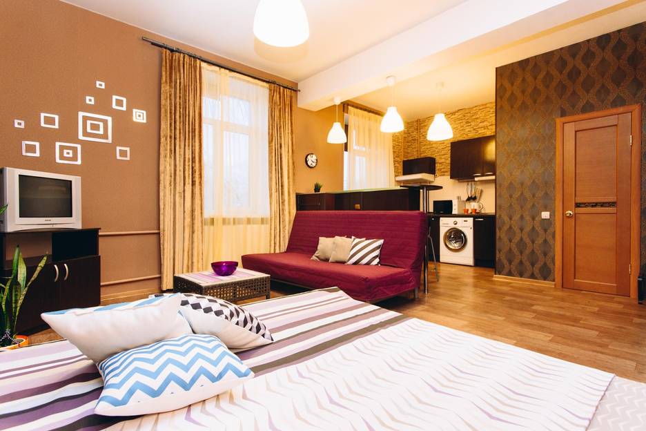 Высокие потолки, большие пластиковые окна с рулонными жалюзями для спокойного сна и отдыха, зональное освещение квартиры, барная стойка с подсветкой. Кухня: столовые приборы, кухонные принадлежности, посуда, гарнитур со встроенной техникой, микроволновка, холодильник, вытяжка, варочная поверхность, обеденная зона. Комната: большая кровать c красивым балдахином для уединения, двуспальный диван, столик, телевизор с кабельным телевиденьем, комод и шкаф для хранения вещей и одежды. Ванна: совмещенный санузел, импортная сантехника, душевая кабина.