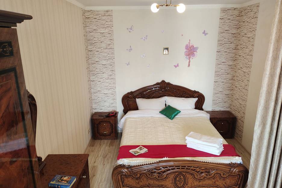 –- Просторная 1-комнатная квартира, зонированная под 2 комнаты. Вмещает до 4 гостей.– Спальня с широкой кроватью и ортопедическим матрасом. Диваны-кровати в зале и на кухне. На кухне есть всё для готовки: эл. плита, посуда, микроволновка, духовка,эл. чайник.