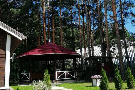 На участке- баня, беседка с мангалом, клумбы с цветами, вокруг участка лес.
