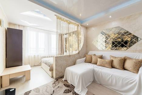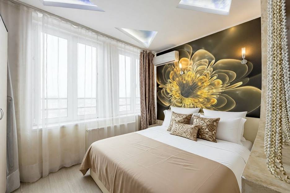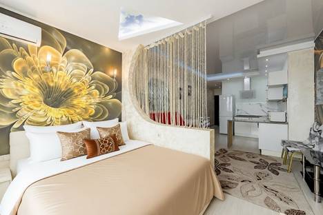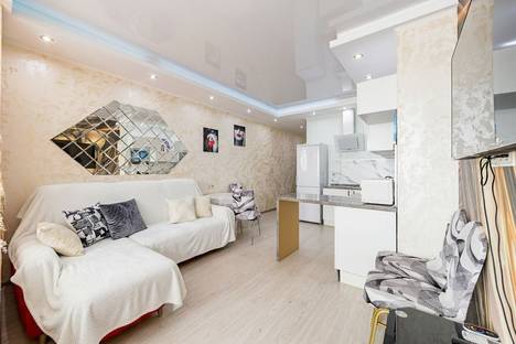 Романтическую обстановку создаст необычная подсветка в спальне на потолке в виде треугольников , а также 10 режимов подсветки на потолке в гостиной . В спальне установлена двухспальная кровать 160х200, в гостиной раскладывающийся диван. Кухонный уголок оборудован всей техникой и посудой .