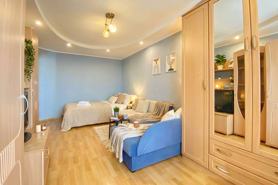 • ✅ Двуспальная кровать (160 см) с чистым бельем из прачечной + диван-кровать (размещение до 4 гостей).
