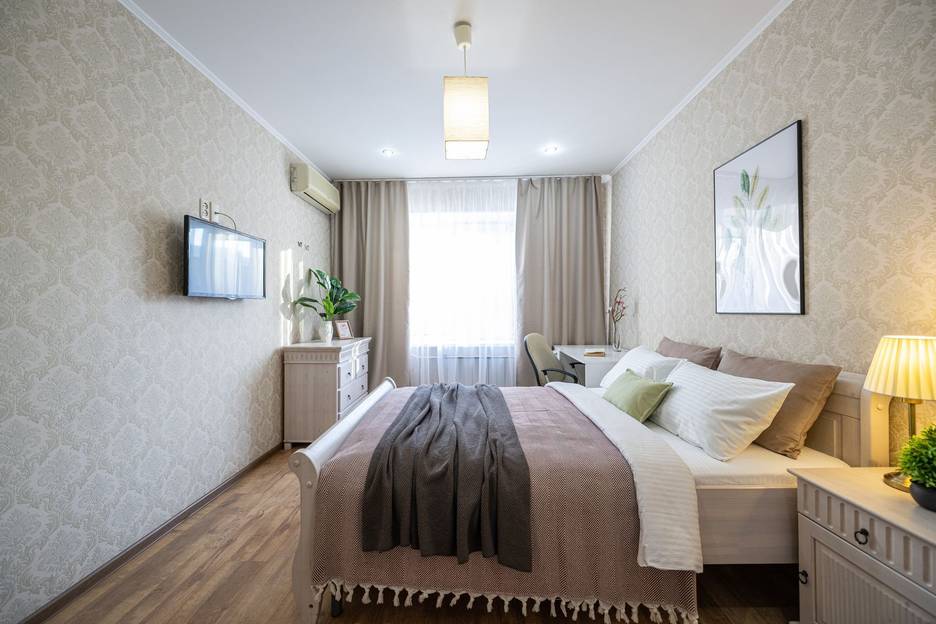 - Обе спальни обставлены изысканной белой мебелью. Стиль интерьера создают яркие детали: аксессуары, шторы и текстиль. В каждой из них двуспальная кровать с ортопедическим матрасом, прикроватные тумбы со светильниками, шкаф для хранения вещей.