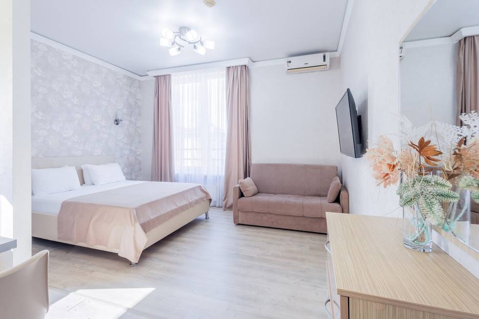 Подходят для 4 гостей, в апартаментах двуспальная кровать и удобный двуспальный диван,кухня располагается через перегородку от спальных мест.