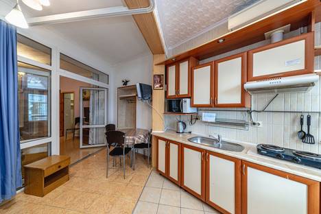 Исторический центр города. Первая линия у пляжа. Собственная закрытая территория-сад у дома с видом на море и столиками. Выход и к пляжу, и в город. Набережная в 5 мин ходьбы. В шаговой доступности большой выбор кафе, столовых, ресторанов и развлечений. Рядом остановка маршруток, идущих до достопримечательностей ЮБК. Автовокзал в 2 км (15 мин пешком). Номер в гостевом доме (частный сектор), Отдельный вход. Площадь апартаментов 45 кв.м. Две комнаты. Одна комната проходная. Первый этаж. Вид в зимний сад.