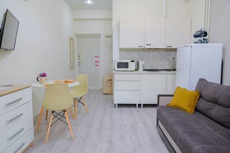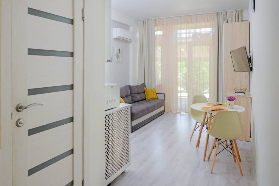Вас ждёт студия с собственной атмосферной террасой для уютных завтраков в утренней прохладе или приятных вечеров. Сдержанный интерьер в светлых тонах создаст ощущение легкости и уюта.