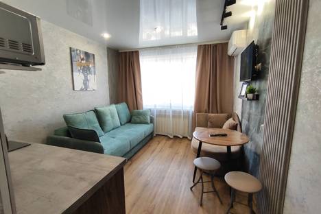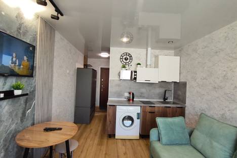 Маленькая уютная студия с дизайнерским ремонтом (18 кв.м), есть все необходимое для комфортного проживания 2-3 х человек. 3 спальных места (2+1): раскладной диван и одноместная тахта. Есть вся необходимая техника и мебель: фен, утюг, гладильная доска, микроволновка, стиральная машина, телевизор, сушилка для белья, плитка, чайник, Кондиционер!!!
