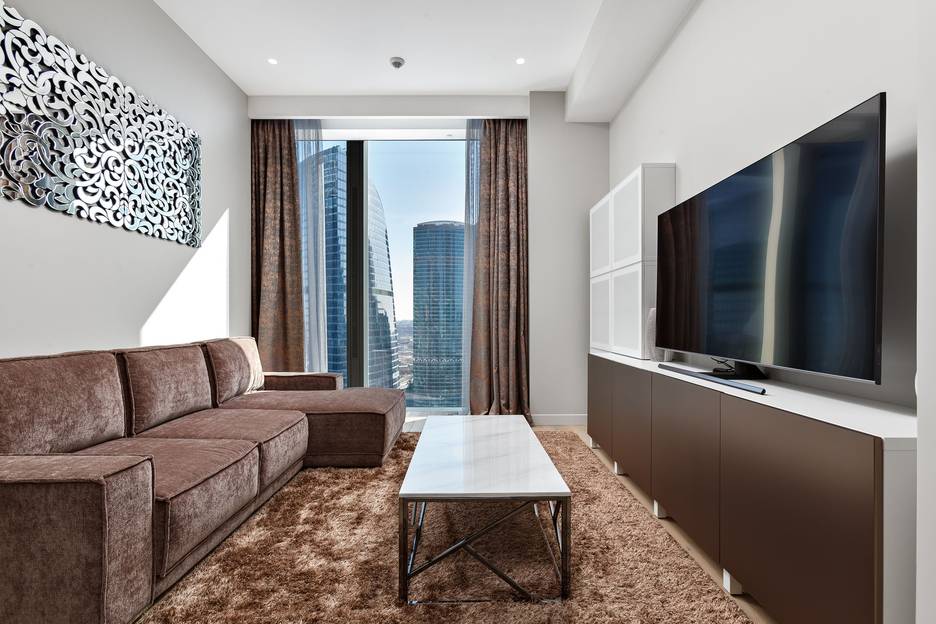 Apartments Расположен на 38 этаже компекса "Neva Towers". Имеет шикарный и дорогой во всех смыслах вид на соседние башни. трех-комнатный апартамент с большой гостинной, уютной спальней, двумя сан-узлами, кухней со встроенной премиум техникой, оборудован всей необходимой техникой мебелью и электроникой. Система Климат-контроля, бесплатный Wi-Fi! В проживание включено: клининг, смена постельного белья, полотенец и банных принадлежностей, тапочки, средства личной гигиены. Внимание уделено всем мелочам для комфортного пребывания вас и ваших гостей. Спальных мест 6. Поздний выезд по договоренности - необходимо согласовать заранее.