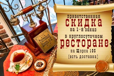Для наших гостей предоставляется приветственная скидка 200 рублей на первый заказ в круглосуточном ресторане «Рум-кафе» на Щорса 105. Есть доставка.