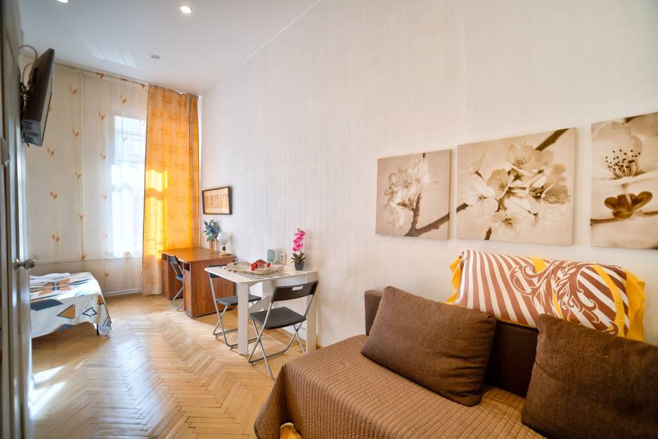 Уютная квартира-студия 22 кв. м. в историческом центре Санкт-Петербурга на ул. Социалистическая 11. В комнате с комфортом разместятся 4 человека; есть одна двуспальная кровать и двуспальный диван кровать, рабочий стол, мини-кухня, холодильник, микроволновка, плита, чайник, санузел со всеми удобствами.