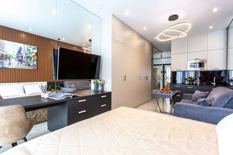 СТИЛЬНАЯ студия с новым дизайнерским ремонтом в доме бизнес-класса с бассейном на крыше. Рассчитана на заселение до 3-х гостей.