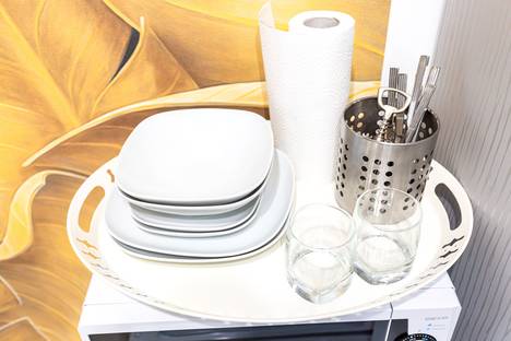В апартаменте есть чайная станция с набором для приготовления чая, тарелки, стаканы, столовые приборы, холодильник, а также микроволновка.