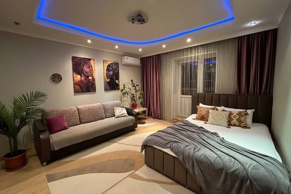 Красивая подсветка в комнате,просторная лоджия 6 кв.м (два выхода),большая ванна.