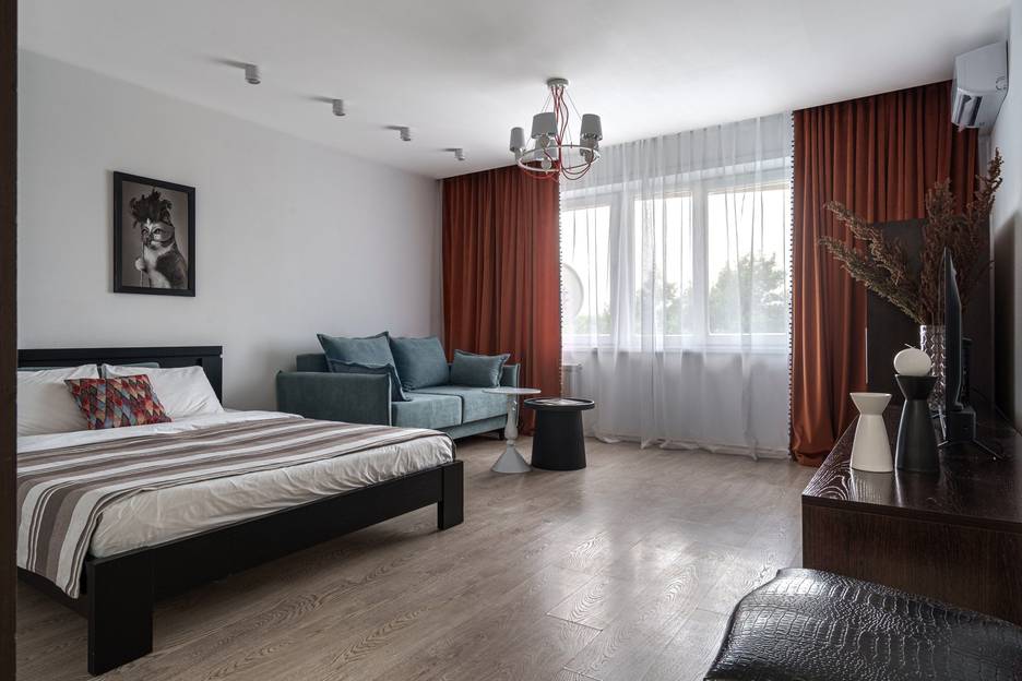 * Есть отдельная комната с большой кроватью, изолированная кухня с барной стойкой, своя гардеробная, душевая кабина.