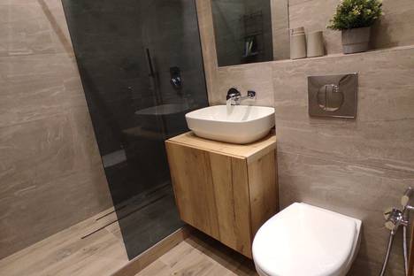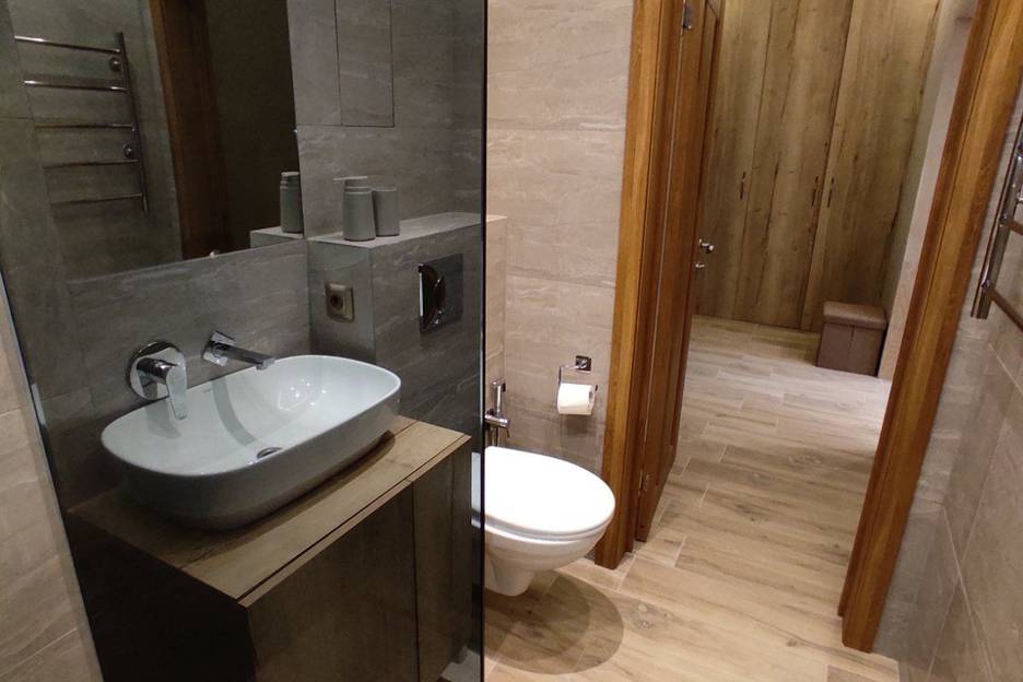 В ванной оборудован гигиенический душ, подвесной унитаз с инсталляцией, раковина с зеркалом, полотенцесушитель; душевая зона с системой тропический дождь, и обычным душем.