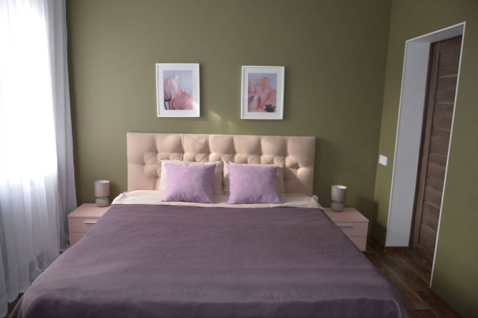 В спальне двуспальная кровать (180×200), в кухне-гостиной широкий двуспальный раскладной диван.
