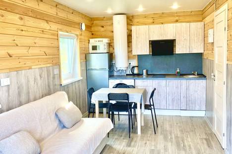 В коттедже есть отдельная спальня и кухня-гостиная с раскладным широким диваном.