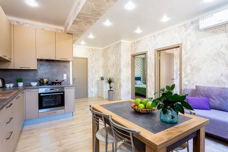 Две отдельные комнаты, просторная кухня-гостиная, санузел с ванной, балкон. Современный ремонт и мебель. TV, Wi-Fi, кондиционер. Кухня оснащена: плитой, духовкой, микроволновкой, холодильником, чайником, столовыми приборами и посудой. Также есть стиральная машина, фен, утюг, гладильная доска, сушилка для белья. Постельное белье и полотенца, средства для душа.