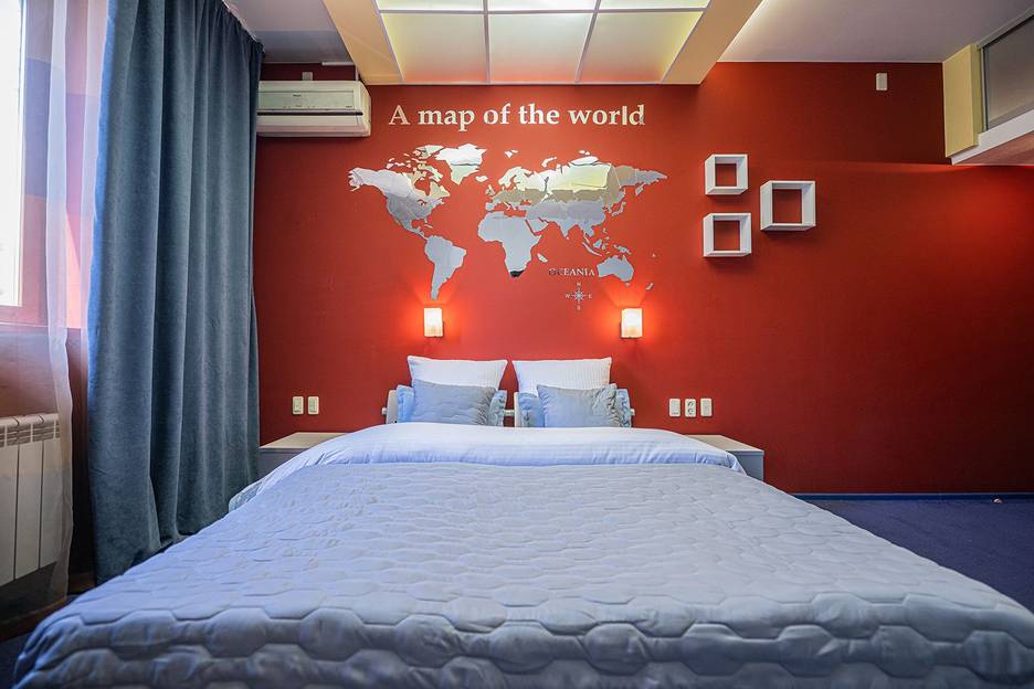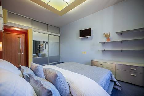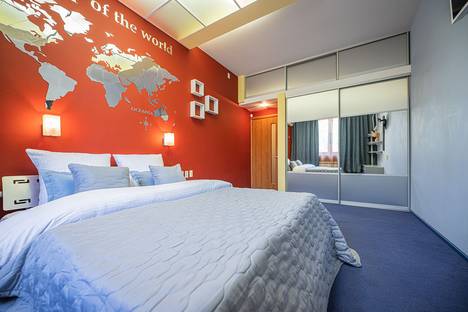 - Стильная спальня с красивым зеркальным панно карты мира располагает к комфортному отдыху. Качественная двуспальная кровать с ортопедическим матрасом гарантирует полноценный сон. Большой встроенный шкаф-купе вместит личные вещи. Наличие кондиционера обеспечит каждому гостю приятный микроклимат. Для абсолютного удобства предусмотрен второй ЖК-телевизор, прикроватные тумбы, настенные светильники и плотные портьеры..