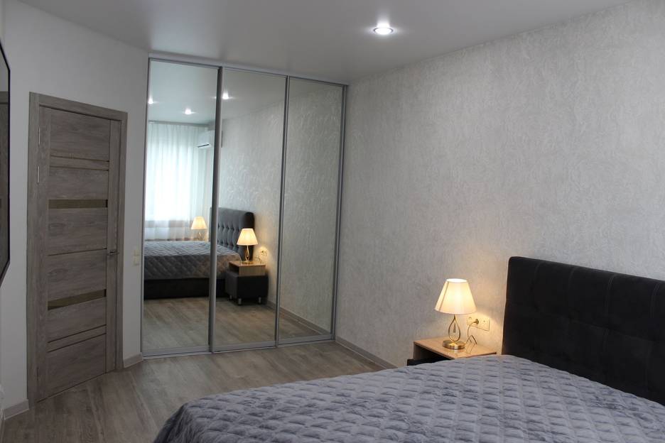 Спальня: удобная двуспальная кровать с ортопедическим матрасом, ЖК телевизор , просторная гардеробная, электрический теплый пол