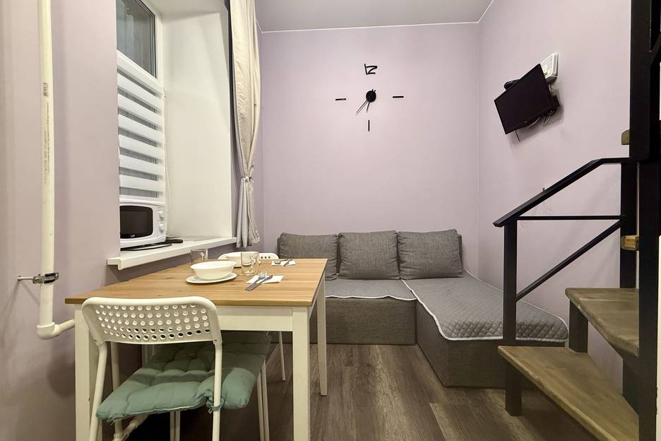 В студии максимум может разместиться 4 человека. В распоряжении гостей удобный диван со спальным местом шириной 120 см. На втором ярусе расположено удобное спальное место (матрас 180/200).
