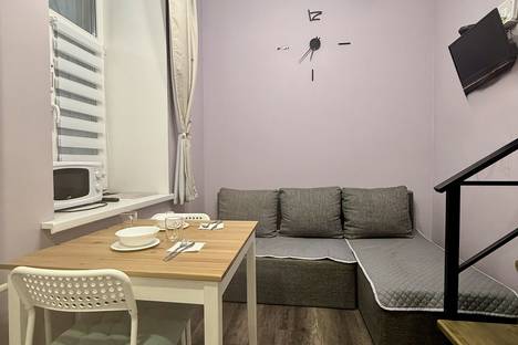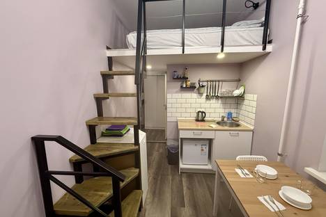 Площадь студии 16 метров (не считая второй ярус), расположена на 2 этаже 4-хэтажного дома на Спасском переулке в Адмиралтейском районе Санкт-Петербурга.