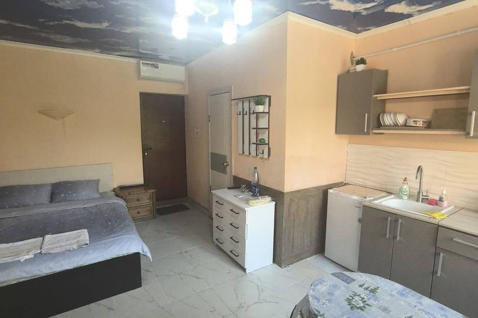 Номер - студио находится в Гостевом доме "На Прямой" в отдельно стоящем здании. Оформлен в светло бежевые тона. В номере свои ванная комната, кухня со всей необходимой техникой и посудой, Wi-Fi. На территории есть мангал. До моря 850 метров, пляж нептун, рядом пляж Кристалл. Рядом с Гостевым домом несколько продуктовых магазинов.