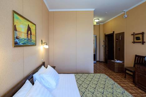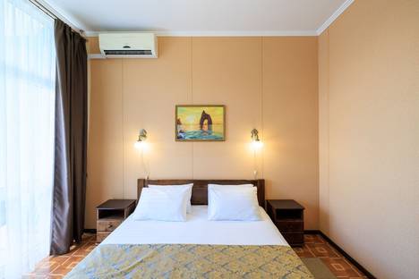 Номер Улучшенный (1 категория с двуспальной кроватью) - 22 кв.м с удобствами (совмещенный санузел с ванной, тапочки, туалетные принадлежности, фен, 2 халата). В номере: двуспальная кровать (1800х2000 см), шкаф для одежды, прикроватные тумбы, стол, стул, посуда, электрочайник, холодильник, LCD телевизор, сейф, кондиционер, балкон с мебелью. Доп. место - еврораскладушка. Вид из номера – на парк, на бассейн.