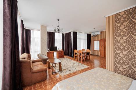 Номер Джуниор Сюит ( С видом на парк) - 45 кв.м с удобствами (совмещенный санузел с ванной, тапочки, туалетные принадлежности, фен, 2 халата). В номере: двуспальная кровать (1800х2000 см), шкаф для одежды, журнальный столик, прикроватные тумбы, стол, стул, посуда, электро чайник, сейф, холодильник, LCD телевизор, кондиционер, гладильные принадлежности, балкон с мебелью. Доп. место - раскладывающийся диван. Вид из номера – на парк.