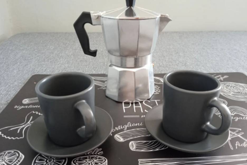 Кухня со всем необходимым - посуда, плита, вытяжка, духовка, СВЧ печь, холодильник, электрочайник, кофеварка.