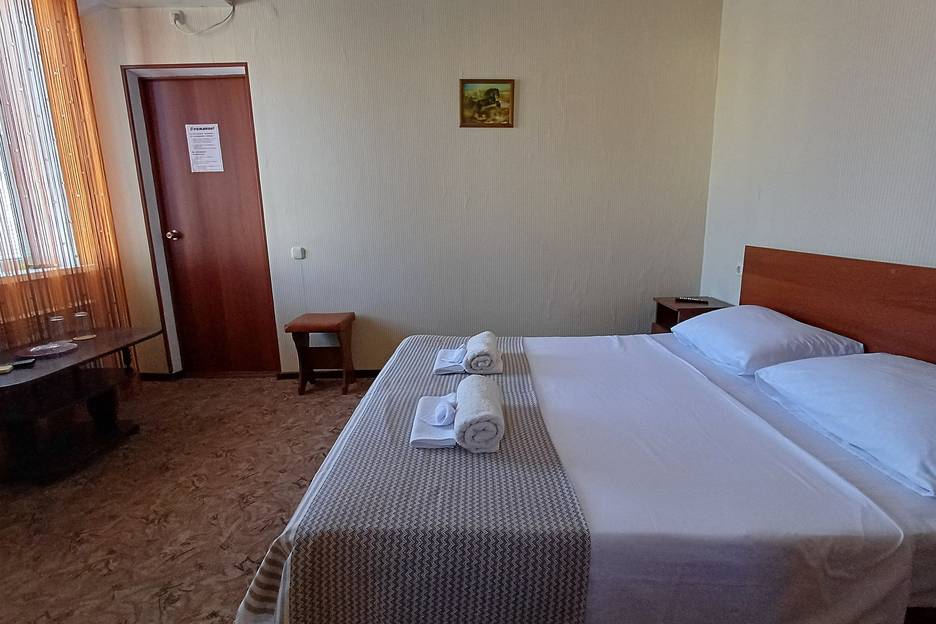 Двухместный номер стандартный расположен на 2, 3 этаже. В номере: кровать, шкаф, плоский телевизор, холодильник, сплит-система, прикроватные тумбочки, журнальный стол, пуфик. Санузел совмещённый в номере:душ, унитаз, раковина.