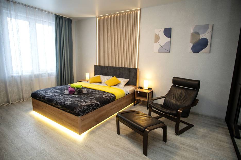 Спальные места: двуспальная кровать + комфортное кресло-кровать. Стоимость указана при размещении до 2-х гостей. При проживании более 2-х гостей дополнительно 500 руб. за гостя. Квартира вмещает до 3-х гостей.