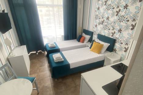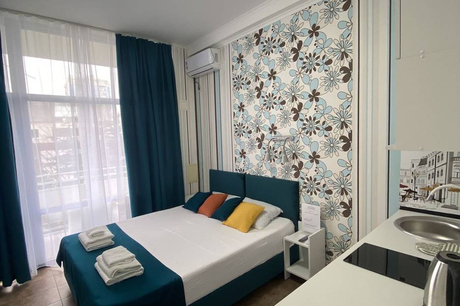 Двухместный номер с открытым балконом и боковым видом на море в светло-бирюзовой цветовой гамме. Вместимость до 2 гостей. Вариации кроватей: Двуспальная кровать (160см/200см) или две раздельные (80см/200см*2). Открытый балкон с мебелью, боковой вид на море. Комплектация: санузел, кровати, тумбы, комод, шкаф, стол, стулья, кухонный гарнитур, микроволновая печь, стиральная машина, электрочайник, электрическая встроенная варочная панель, посуда, холодильник, телевизор, фен, утюг, WI-FI доступ в сеть Интернет , постельное белье, полотенца, туалетные принадлежности.