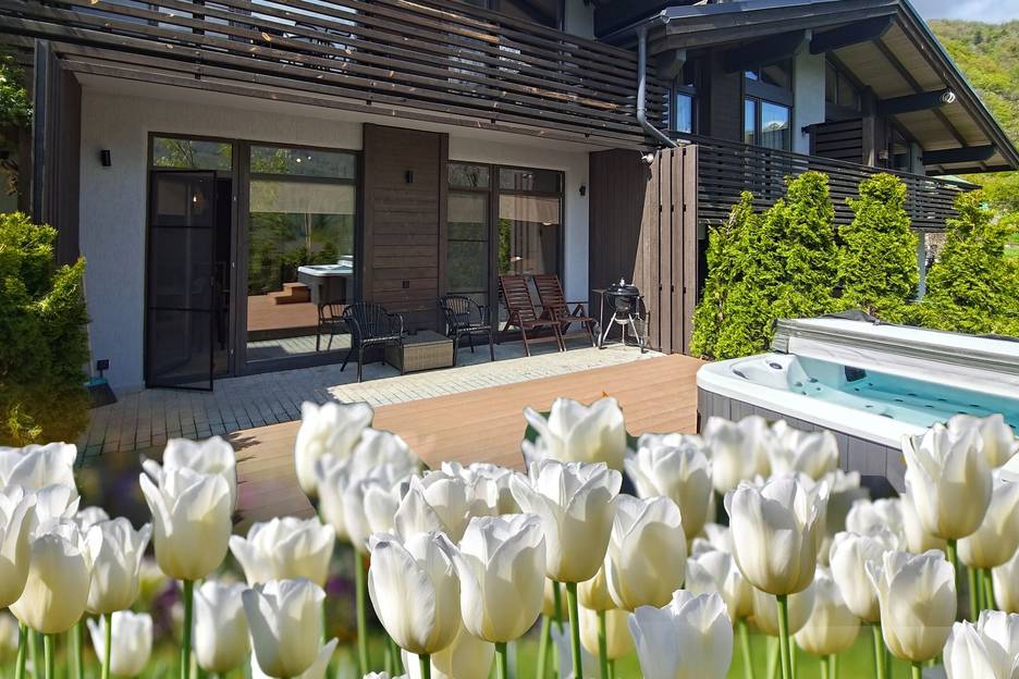 Двухэтажный таунхаус с парковкой на территории двора. В окружении красивая застройка домами в стиле шале. Из всех окон дома красивый открытый вид на горы и зелёный массив.