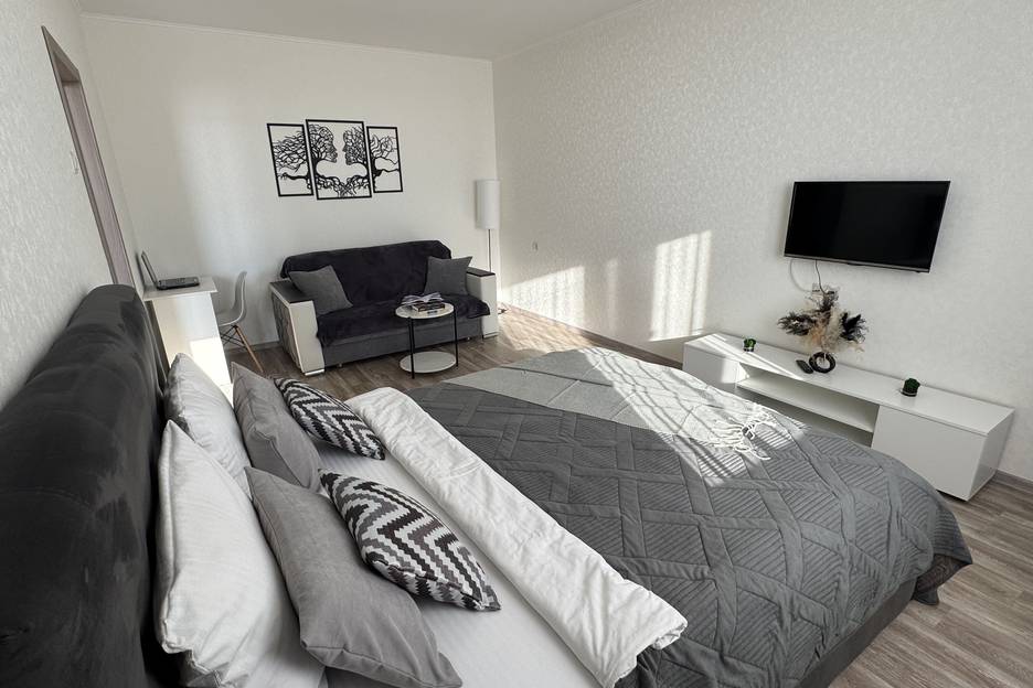 - В квартире вас ждет двуспальная кровать с ортопедическим матрасом и удобный двухспальный диван для отдыха. Постельное белье.
