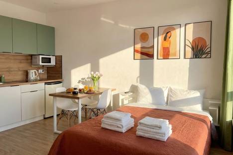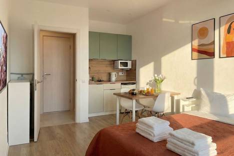 В студии новый ремонт, новая бытовая техника. Есть полноценная кухонная зона с необходимой техникой и посудой. При заезде вас будет ждать 2-х местная кровать с ортопедическим матрасом, свежее чистое белье и полотенца, одноразовые гели, шампуни и мыло.