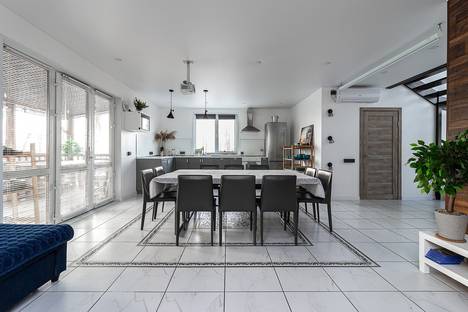 - Стол внутри дома на 10 гостей. Комфортная рассадка до 12 человек, максимально 15.