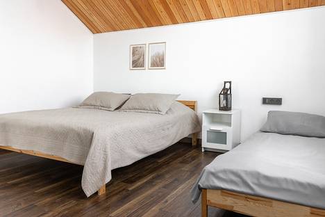 - На первом этаже кухня-гостиная с раскладным диваном (двухместное спальное место) и санузел, баня на дровах и выход на улицу к банному чану. На втором этаже 3 спальни (одна двухместная комната и две трехместные)