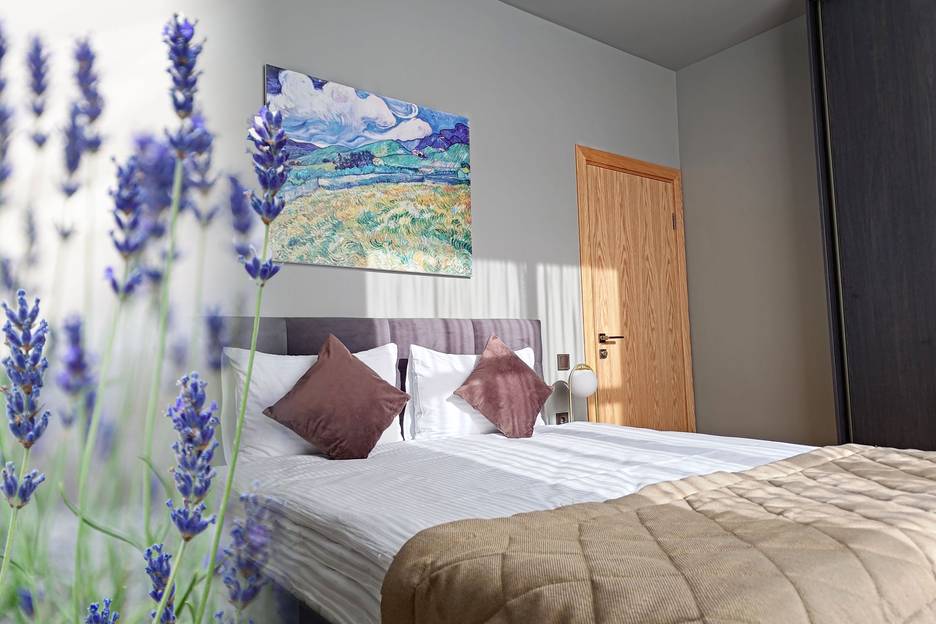 Апартамент со спальной комнатой и гостиной. Современный интерьер и меблировка.