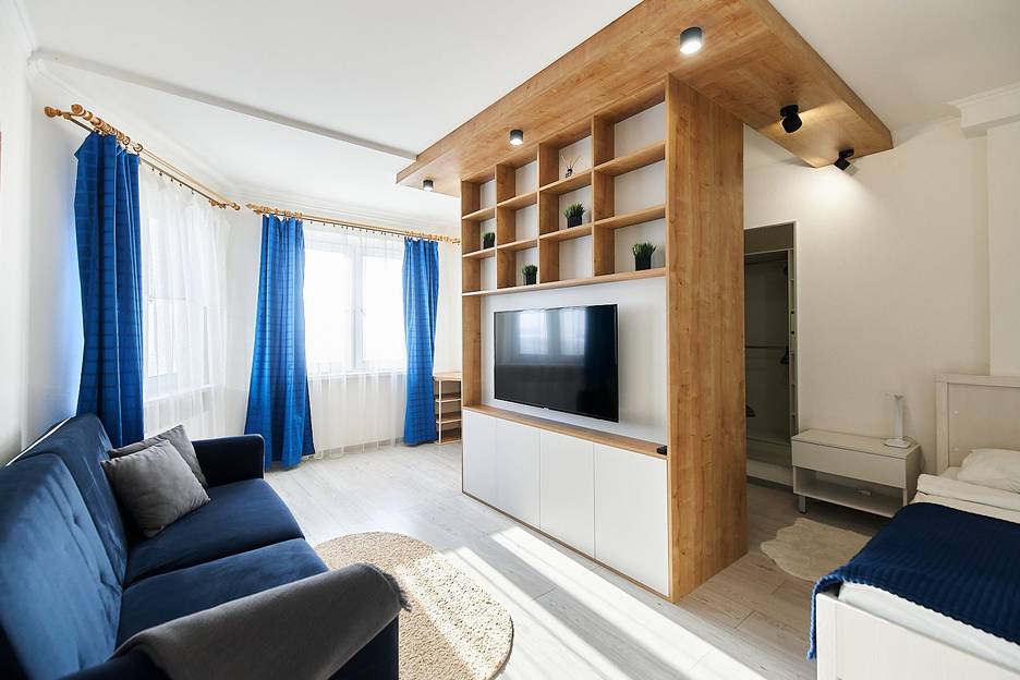 Пространство разделено на зоны: спальную, гардеробную, рабочую и зону для отдыха и развлечений. Встроенная изготовленная на заказ мебель и новая бытовая техника: стиральная машина, посудомоечная машина Siemens, варочная поверхность Maunfeld, вытяжка, духовой шкаф, электрочайник, холодильник Atlant, ЖК телевизор Samsung с диагональю экрана 50 дюймов, утюг, фен для волос, сушилка для белья, гладильная доска.