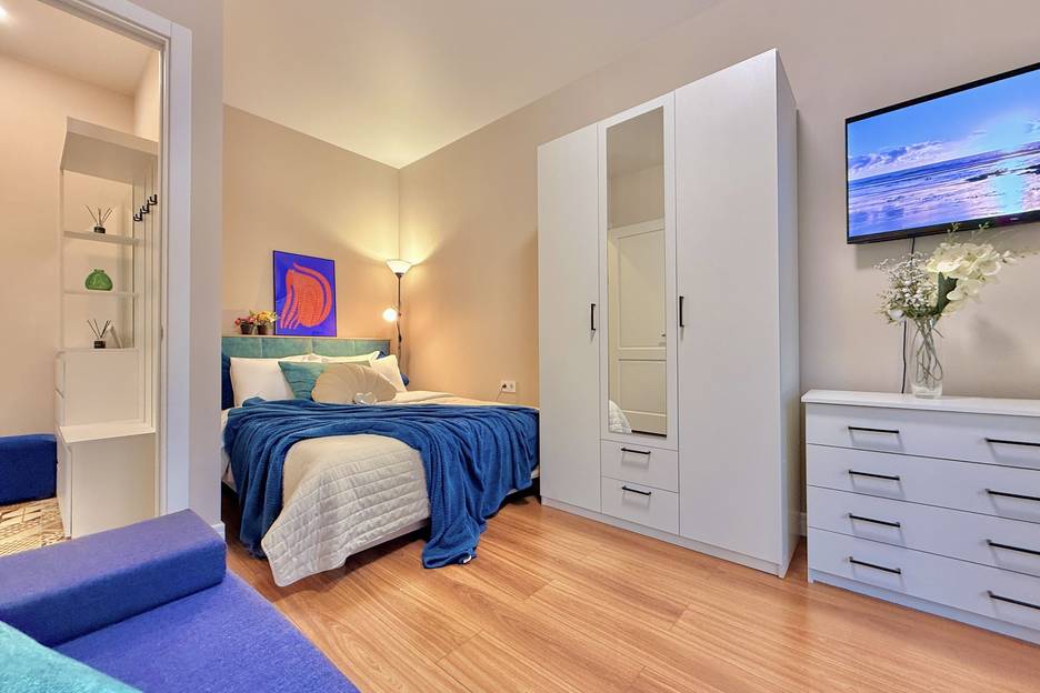 В спальне имеются диван-кровать и двуспальная кровать, ЖК телевизор, шкаф для одежды, комод. На кухне: обеденная зона, Кухонный гарнитур со всей бытовой техникой, раскладной диване. В квартире есть все необходимое холодильник, стиральная машина, электрический чайник, СВЧ, фен, утюг, кондиционер, гладильная доска, посуда.