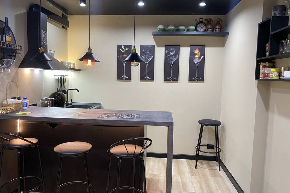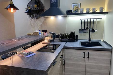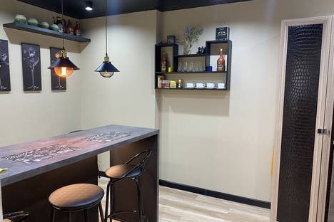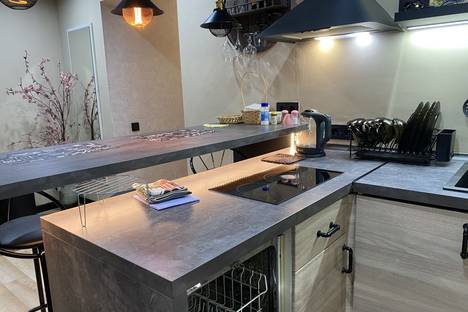 Зона кухни-бара снабжена всем необходимым для приготовления пищи и уютного времяпровождения: барная стойка с подсветкой и подвесными светильниками над ней; 4 барных стула; винница с фужерами; кухонный гарнитур со встроенной варочной панелью, вытяжкой над плитой, посудомоечной машиной; холодильник, микроволновая печь, электрочайник, кухонная утварь. Есть вся необходимая посуда для того, чтобы вы смогли красиво и со вкусом сервировать и семейный обед, и романтический ужин.