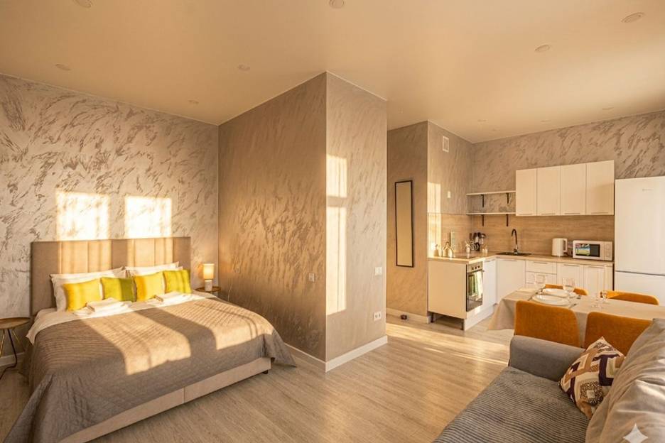 ✔️ КВАРТИРА: 1 комната, двуспальная кровать + 1 раскладной диван. Будет комфортно разместиться 2-4 гостям. Для вас готово свежее постельное бельё (100%-й хлопок) и полотенца. В квартире есть ванна и балкон.