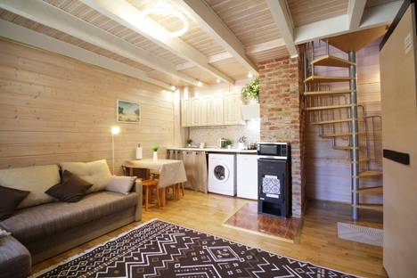 Зона кухни: холодильник, стиральная машина, плита, микроволновая печь, эл. чайник, посуда (бокалы, чашки, столовые приборы, сковорода, кастрюля, принадлежности для мангала и т.п.), чай/кофе. Обеденный стол. Винтовая лестница на 2 этаж.