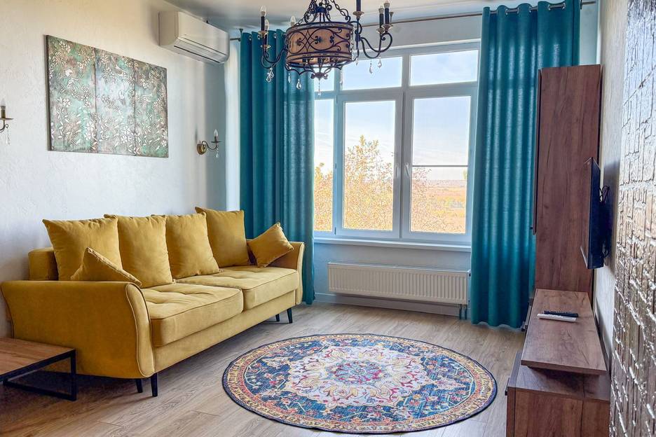 3. Широкую (160см) кровать с хорошим матрасом и чистым постельным бельем для крепкого сна. Дополнительно (по запросу) кровать =раскладушка. В зоне гостиной удобный, раскладной диван, где дополнительно могут разместиться два человека. На диван предусмотрен топпер- матрас.