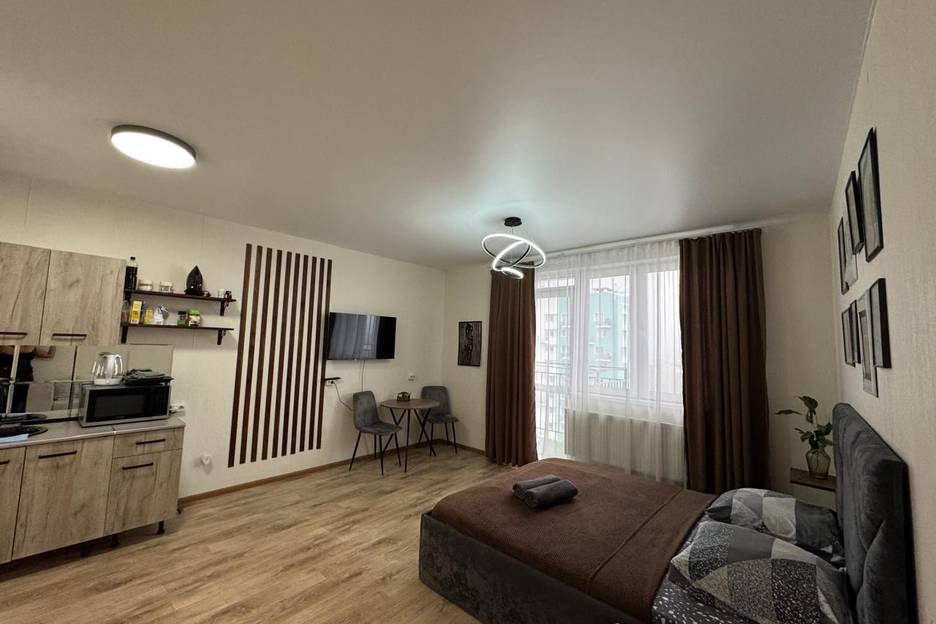 Однокомнатная квартира на высоком этаже. 2 спальных раздельных места. Двуспальная кровать и софа .