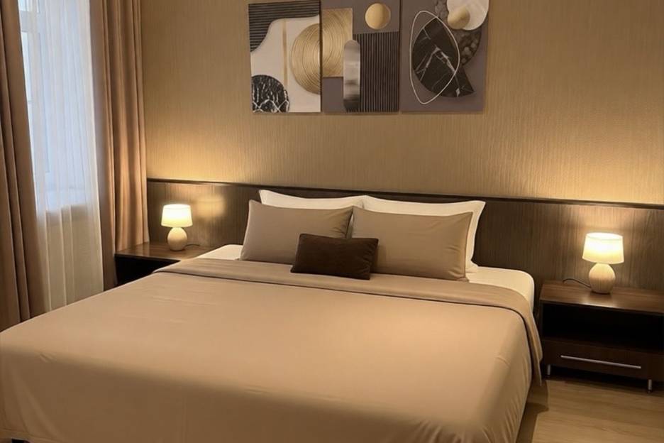 В каждой спальне находится просторная гардеробная и 2 односпальные кровати. В гостиной расположен двухспальный диван, кондиционер. В прихожей имеется удобный шкаф. Бесплатный wi-fi.