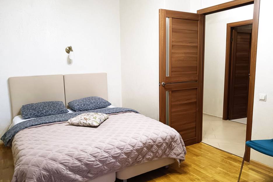 ✔️ В квартире могут расположиться до 4 человек. В спальне есть двуспальная кровать, на кухне диван-кровать.