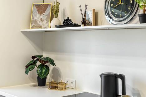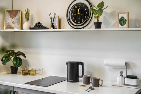 Кухня включает в себя холодильник, печь, чайник, микроволновую печь, набор необходимой посуды, что позволит вам готовить разнообразные блюда.