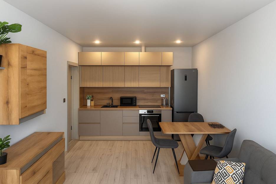️ Кухня оборудована: Холодильником, Варочной панелью, Микроволновой печью, Чайником, а также посудой и столовыми приборами.