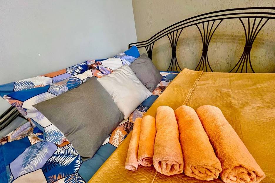 Мы были на машине и местоположение было не очень важно, чистая, просторная квартира, есть все необходимое, большой балкон, посудных наборов всего 4, нас было 5ро(маленький ребенок без места) вот не досталось, но это мелочь)))